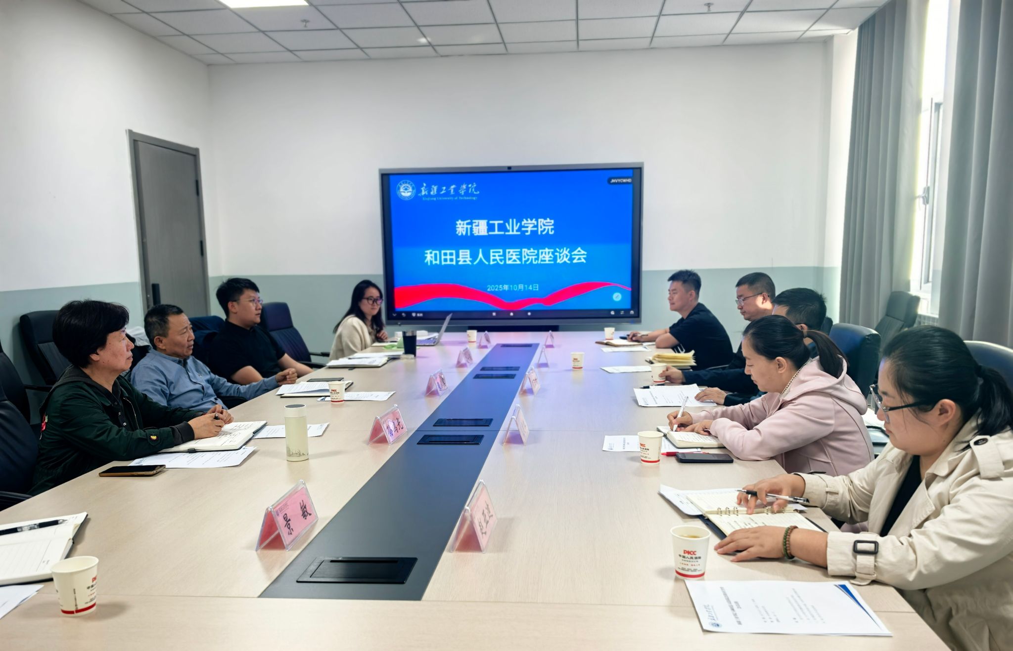 2025年10月14日16:30,党委副书记张小宾携基建后勤处校医院相关人员与和田县人民医院共同召开医疗合作座谈会。会议围绕如何提供医疗服务、开通便捷高效绿色通道以及公共卫生服务等内容开展交流。