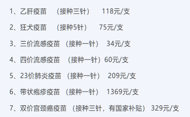 4.接种内容:乙型肝炎、流感、宫颈癌、肺炎、带状疱疹疫苗等。三价流感疫苗53元/支;四价流感疫苗80元/支。
